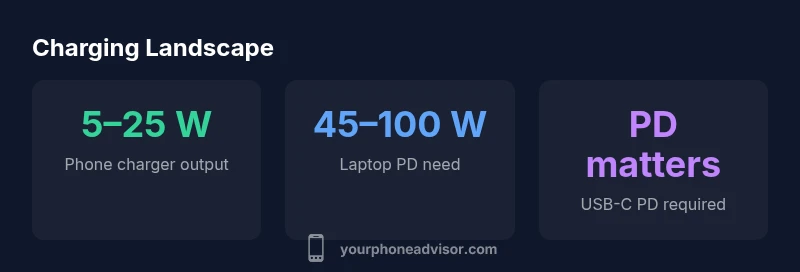 USB-C Power Delivery (PD) is the technology that enables higher, negotiable wattages between a charger and a device. When you connect a PD-enabled USB-C charger to a PD-capable laptop, the charger and laptop communicate to select an appropriate power level. This negotiation is what makes USB-C PD powerful: you can, in principle, push more energy through a single cable safely. The Your Phone Advisor team notes that understanding PD is essential before attempting any charging from a phone charger. If your laptop supports USB-C charging, and your charger can negotiate a higher wattage, you have a real, but conditional, pathway to power your laptop from a phone-friendly charger. Importantly, not all USB-C chargers are created equal; many phones supply far less wattage than what a laptop needs, and many cables are only rated for certain levels of current. As a consumer, verify both the charger’s output and cable rating, and confirm your laptop’s USB-C charging compatibility with the manufacturer’s documentation.