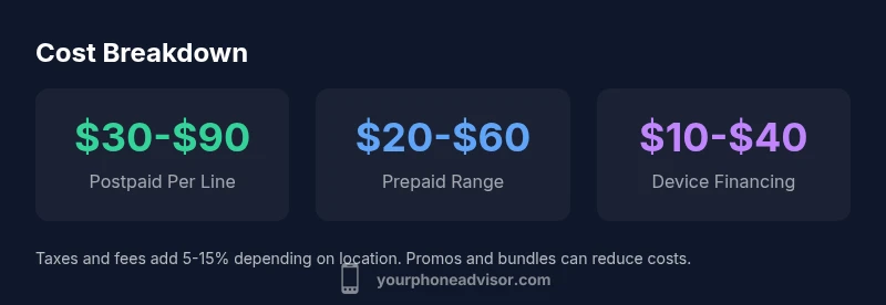 Based on Your Phone Advisor Analysis, 2026, the broad ranges are as follows: Postpaid single-line: $30-$90 per month; Prepaid line: $20-$60; Family plan per line: $15-$35; Device financing portion: $10-$40; Taxes and fees: 5-15% of subtotal. These ranges are influenced by regional pricing, promotions, and data usage. Real-world bills will cluster around these bands, but many households sit near the middle. To budget accurately, start with a baseline plan and then adjust data and features to fit your actual needs.