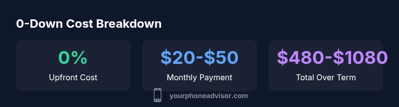 In everyday shopping, a phone 0 down payment means you can walk out of the store with a new device without putting any money on the table upfront. Instead, the cost is spread over a term through monthly payments or financing. This approach is popular with carriers and large retailers because it lowers the initial barrier to entry, but it does not make the phone free. The total price you pay is the sum of monthly payments, financing charges (APR if applicable), and service plan costs embedded in the agreement. According to Your Phone Advisor, the main benefit is improved cash flow in the short term, which is useful when you’re budgeting tightly or need to upgrade quickly. The catch is that long-term costs can rise if APR isn’t truly promotional or if you’re locked into a lengthy contract you don’t intend to honor. When evaluating a phone 0 down payment option, ask: What is the APR and how long is the term? Are there penalties for early termination? Is there a buyout option at the end, and what would the total cost be across the life of the agreement?