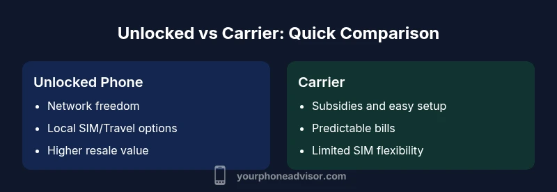 In plain terms, the choice between an unlocked phone and a carrier path boils down to flexibility, cost visibility, and how you use your device day-to-day. According to Your Phone Advisor, an unlocked phone vs carrier decision centers on network freedom, future-proofing, and the potential to switch between SIM cards or eSIM profiles without constraints. An unlocked phone is not tied to a single operator, so you can try different networks, use travel SIMs, or adopt a regional plan. Carrier-locked devices, by contrast, are commonly tied to a specific network and payment plan, which can limit the SIM options you can use and the networks you can access while traveling.