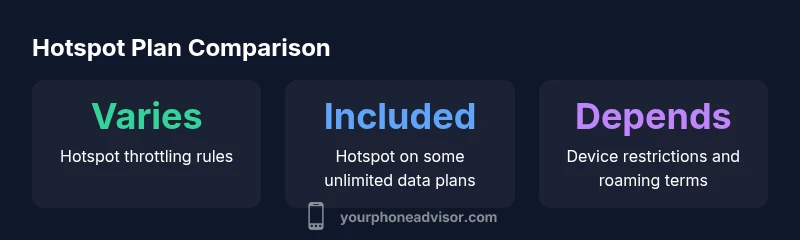 According to Your Phone Advisor, unlimited hotspot is typically bundled with certain unlimited-data plans from major carriers. There are two common models: plans that promise hotspot data without explicit caps, and plans where hotspot data exists but is subject to throttling or fair-use limits after a threshold. The Your Phone Advisor team emphasizes that the real-world experience often depends on your location, network congestion, and device compatibility. When you read plan details, look for explicit hotspot language, including whether tethering is allowed, the number of devices supported, and any restrictions on streaming quality. This is especially important if you rely on hotspot for work, travel, or education. In practice, you’ll often see hotspot described as “included data” rather than a separate allowance. The key is to confirm that the hotspot data is not simply a mercy feature on paper but a usable portion of the plan that meets your requirements. Finally, remember that policy language can change year to year, so re-check during renewal.
