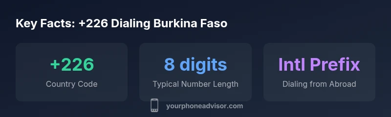 The country calling code for Burkina Faso is +226. When dialing from abroad, use +226 followed by an eight-digit local number, or dial 00 226 if your country uses 00 as the international prefix. From the Your Phone Advisor perspective, always verify the exact number and its mobile vs. landline prefix before calling to avoid misdialing.