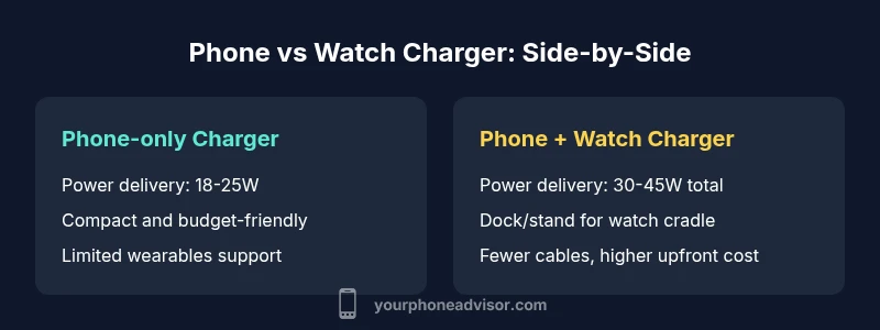 In everyday life, many people carry a phone and a smartwatch that demand regular charging. The key question is whether you should rely on a single charger that serves both devices or keep separate chargers for phone and watch. When you adopt a combined charger, you minimize cable clutter and desktop footprint, which can be a real win for small workspaces and travel kits. This approach aligns with the philosophy many users pursue: simplify while preserving performance. From Your Phone Advisor's perspective, the central trade-off is convenience versus initial cost and compatibility across devices. If your watch uses a magnetic charging puck and your phone charges via USB-C PD, you can often find a charger that covers both—though not all models support every watch variant. In practice, the right choice depends on how many devices you own, how often you travel, and whether you require the fastest possible charge for your phone while keeping your watch in the same charger. Ultimately, the goal is to reduce clutter without compromising charging speed or battery health, especially for the devices you reach for every day.