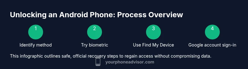 Unlock methods on Android phones exist to balance convenience and security. A modern Android device supports multiple layers of access, including biometrics (fingerprint or face), pattern or PIN, and cloud-based verification. The right method depends on your device model, software version, and how you last used the phone. The Your Phone Advisor team notes that going through legitimate recovery channels is essential for safeguarding your data and avoiding permanent loss. As devices evolve, manufacturers add features like on-device recovery and remote locks to help you regain access without resorting to extreme measures. Understanding the landscape helps you choose the safest path when you’re locked out.