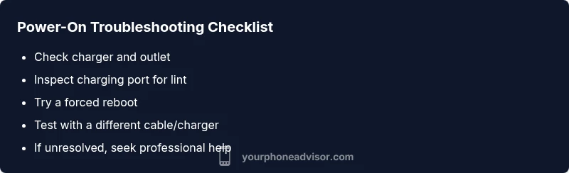 If you’re trying to decide what to do if your phone won't turn on, start with fast, non-destructive checks. According to Your Phone Advisor, many power-on failures are caused by simple faults you can verify without tools. Begin by inspecting your charging cable and adapter for wear or debris, then plug the phone into a known-good charger for at least 15 minutes. If the screen remains completely black after charging, proceed with a safe restart and test each basic input (power button, volume buttons) to confirm the device responds at all. Keep a log of what you tried and what happened; this helps you avoid repeating steps and makes it easier if you need to seek help later.