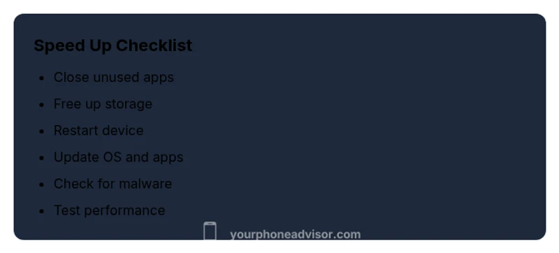 - Identify bottlenecks by noting lag points and recent updates. 2) Free up storage and close background apps. 3) Update OS and essential apps. 4) Clear caches and data from problematic apps. 5) Reboot and perform a clean boot to isolate culprits. 6) Consider a factory reset only after backing up data and confirming hardware is healthy.