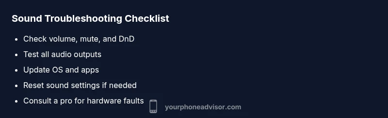If you're asking why phone sound is not working, start with quick checks: confirm volume and mute state, disable Do Not Disturb, and test with different audio outputs. Many issues are software-related; on success, update OS, reset the sound settings, or reboot before seeking hardware help.